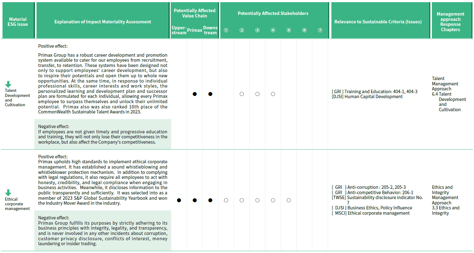 The ESG Office of Primax and the top executives of each unit at Tymphany conducted a positive and negative impact scenario analysis of each ESG issue based on Primax Group's actual management status, and then assessed the impact posed by each ESG issue externally (economy, environment and population (including human rights thereof) and internally (Primax’s operations)based on the impact scenarios. When assessing the significance of impacts, the likelihood and severity (scale, scope, and remediation difficulty)/importance(scale, scope and likelihood) of each ESG issue shall be taken into consideration.Meanwhile, the level of concern questionnaire was also conducted with respectto the seven major stakeholders, and a total of 64 valid questionnaires were collected as a reference for determination of material ESG issues.