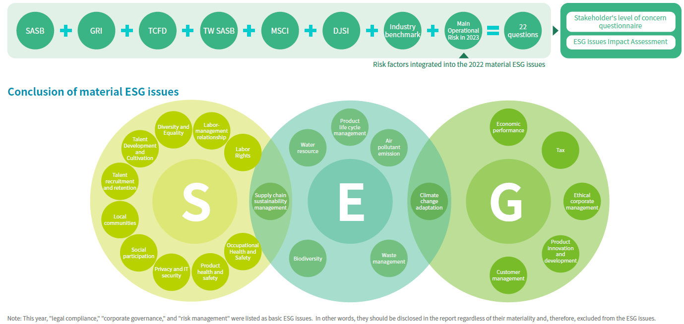 Prior to the ESG issues assessment, we first compiled the ESG issues that might pose some impact on the external economy, environment, human rights or company operations, in reference to sustainability standards and regulations (GRI, SASB, TCFD), ESG rating institutions (DJSI and MSCI, etc.), Rules Governing the Preparation and Filing of Sustainability Reports by TWSE Listed Companies, Issues of Concern to Stakeholders, Material Topics in the Upstream and Downstream Segments of the Value Chain (peers and major customers), Industry Characteristics and Relevant Regulations, and ESG advice and suggestions. In addition, during the year, Primax continued to integrate the 2024 corporate risk items, which include sustainability risks, climate-related risks, and other emerging risks, into the list of sustainability topics as sources for impact assessment. This approach ensures the completeness and relevance of the topics and helps align assessment results with global sustainability trends and investor priorities.